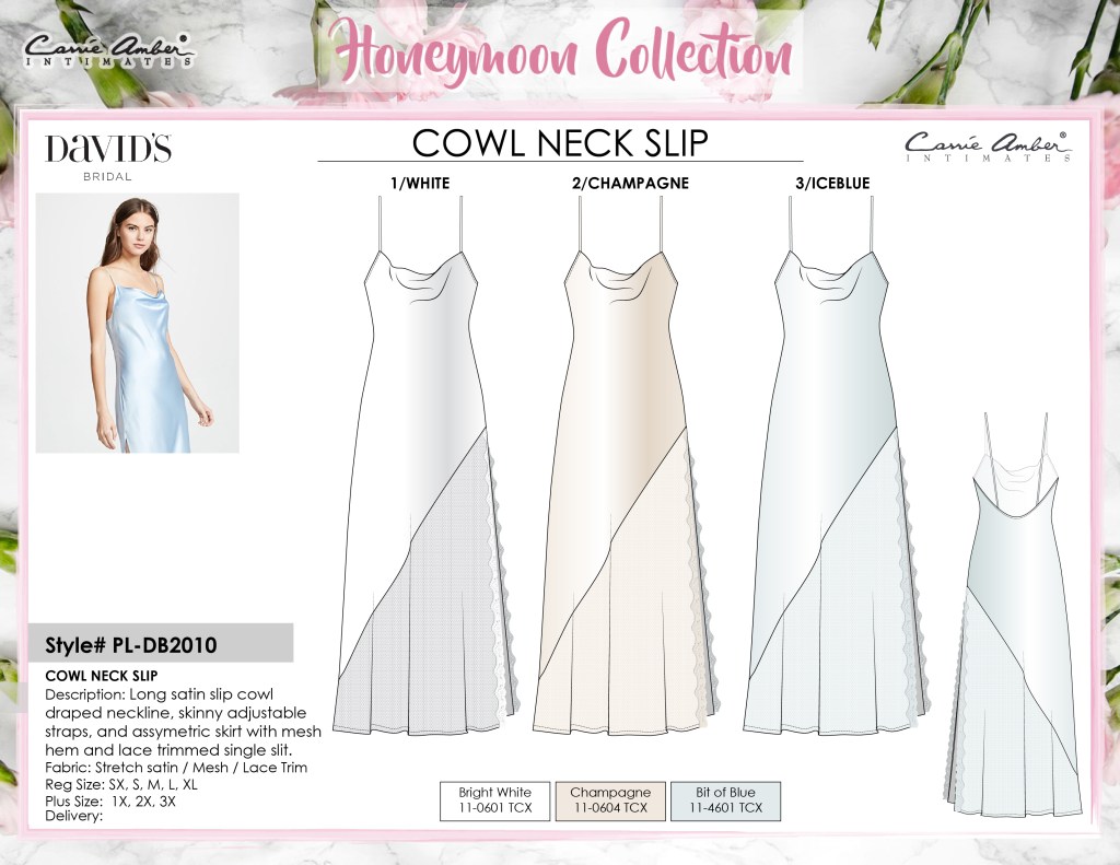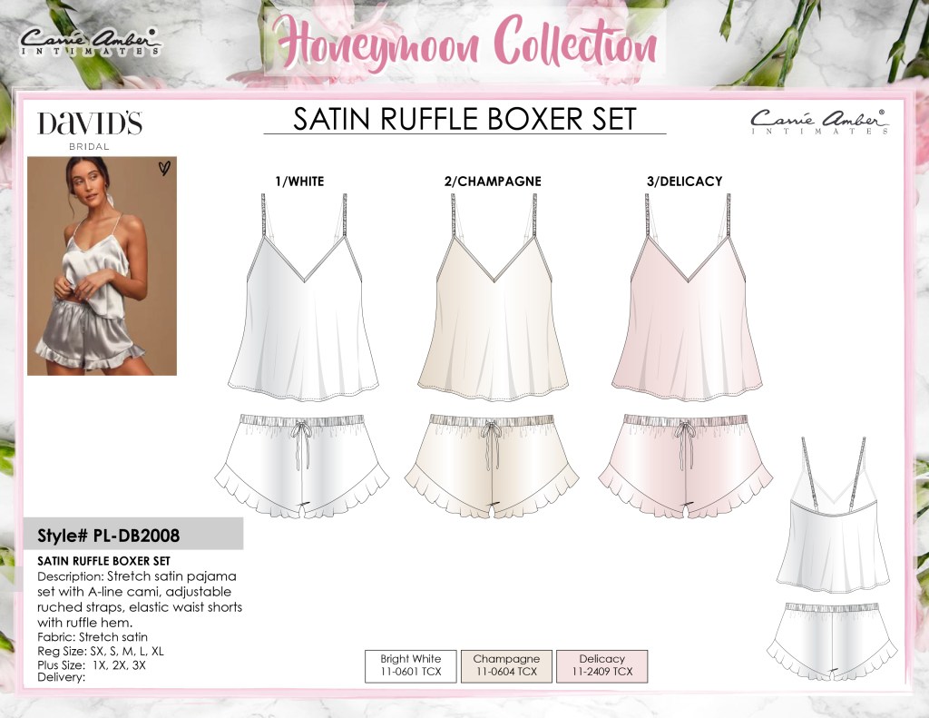 At Carrie Amber, I worked on a variety of lingerie. I developed babydoll, teddy, slips, and sexy sets. I also really enjoyed working on novelty lingerie as well as bridal. Lingerie presents a unique challenge with all of its components, specialty fabrics, and construction details, but I enjoy the challenge!