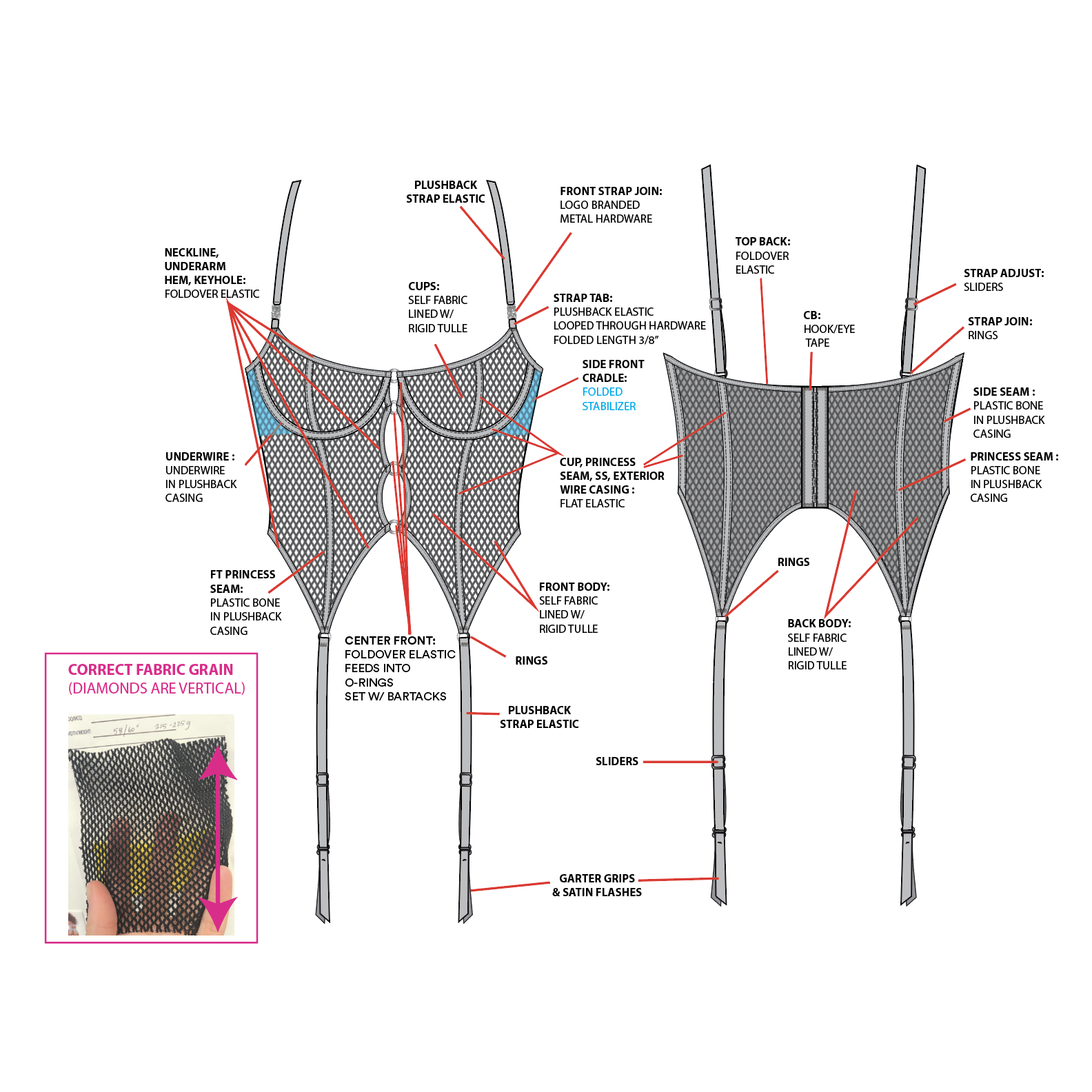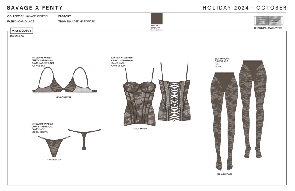 I was honored to be assigned to the Savage X Diesel collaboration in mid-2023. Project direction was given by Adam Selman, Rihanna, and Glenn Maartens. My part in the project was attending fittings with our collaboration partners, creating CADs, updating all tech packs, managing the custom hardware, and maintaining line sheets for all Women’s Intimates pieces. It was a challenge that helped me grow as a designer.